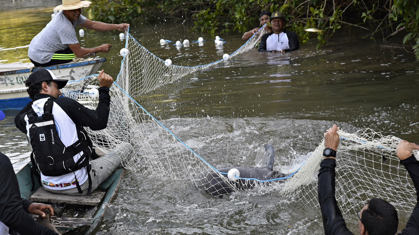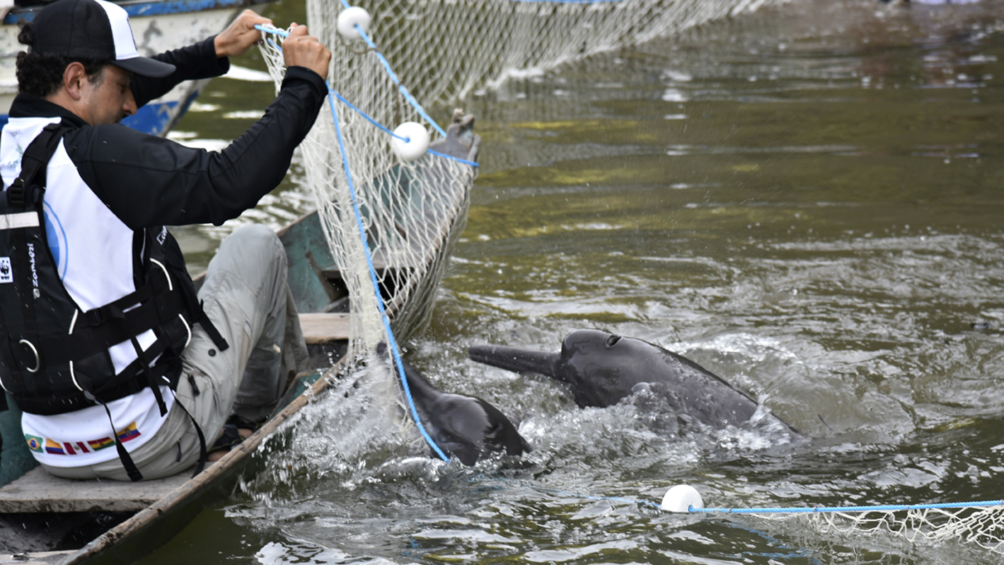 Roberto: Nee, natürlich nicht. Wir mussten die Delfine dazu fangen. Das machten die Fischer, die WWF-Kollegen und ich zusammen. Wir trieben die Tiere zunächst in Seitenarme des Flusses und schnitten ihnen mit Netzen den Rückweg ab. Anschließend wurden die Delfine mit einem zweiten Netz an einem Flussabschnitt festgehalten. Mit einem Treibnetz konnten sie dann ans Ufer gezogen werden.