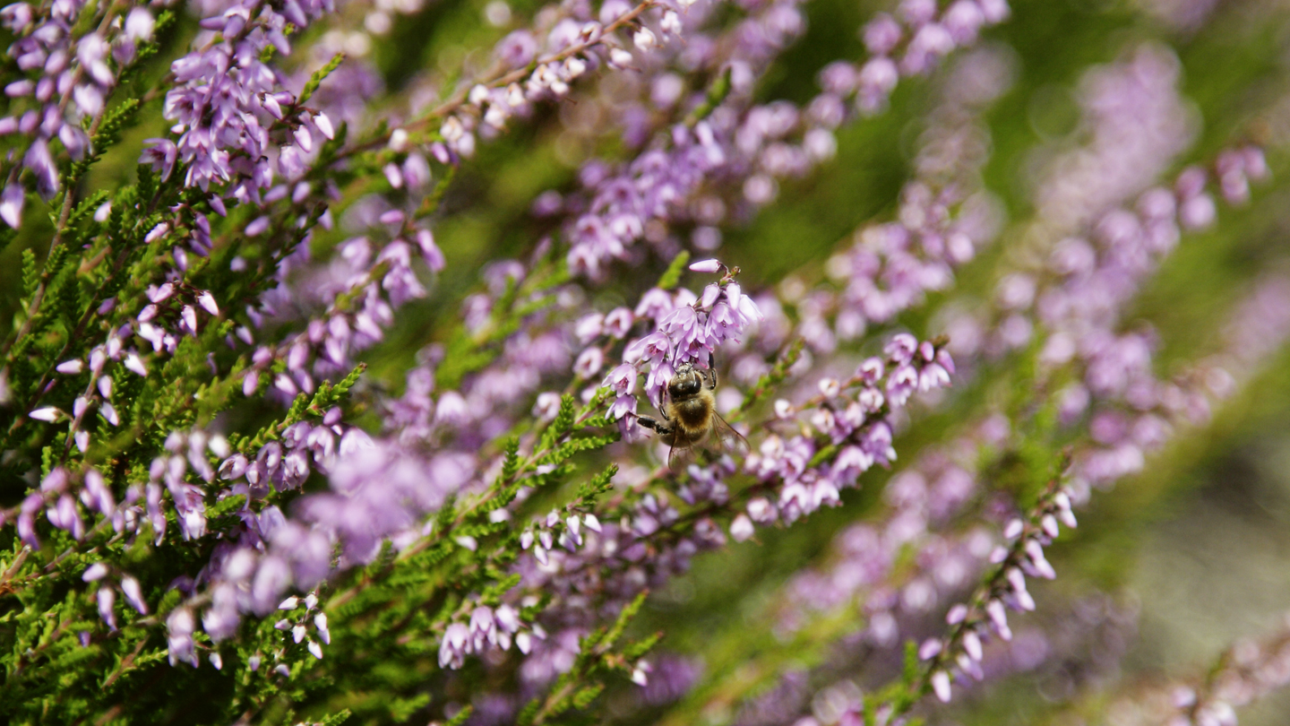 Die Besenheide wird auch Heidekraut genannt. Im Spätsommer verwandelt sie die Heidelandschaft in einen lilafarbenen Teppich aus Blüten. Die blühende Besenheide zieht zahlreiche Tiere an – Schmetterlinge genauso wie Bienen, Käfer und andere Insekten. Auch die typische Schafe der Heide, die Heidschnucken, ernähren sich von der Besenheide.