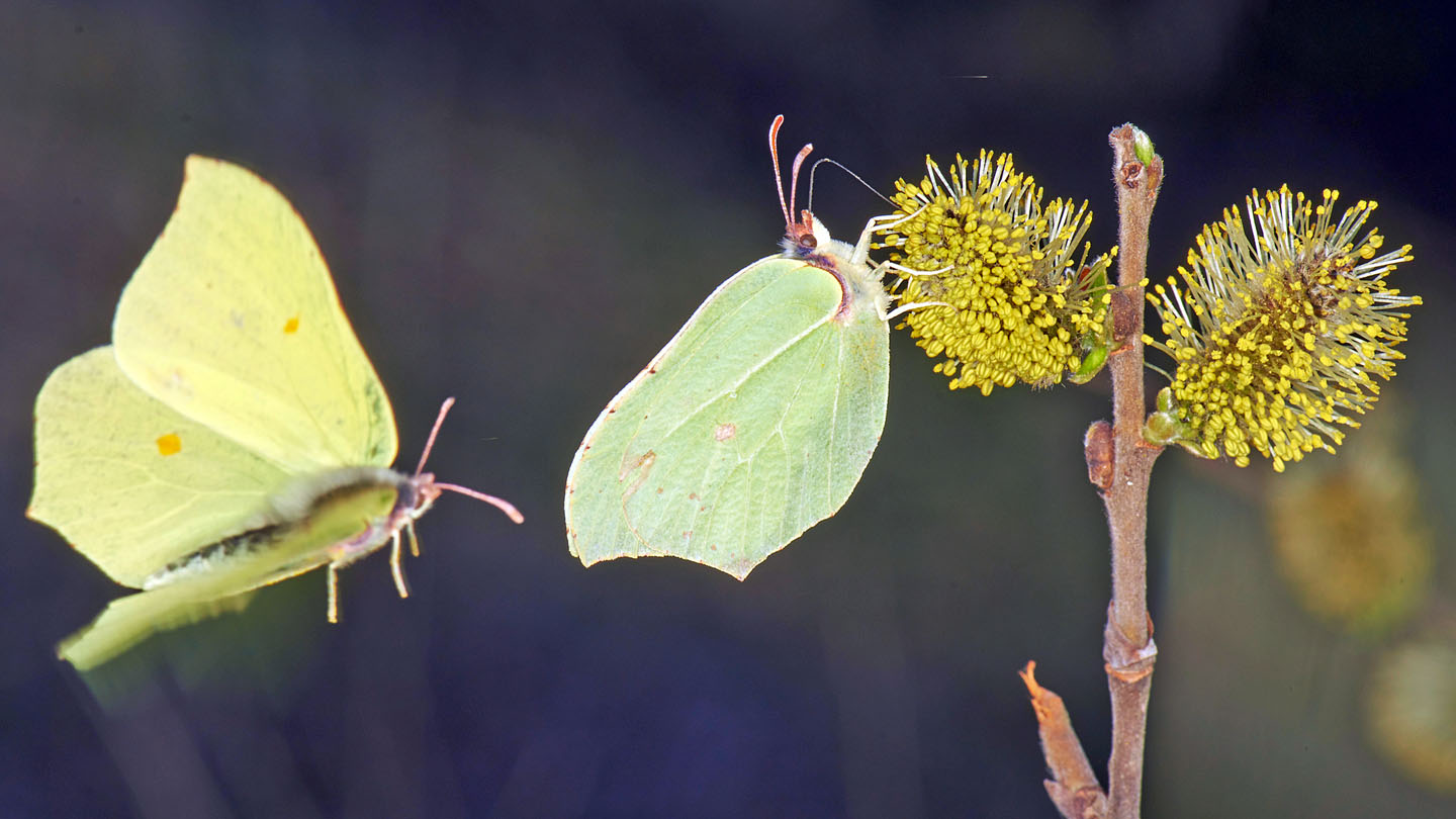 Drei Schmetterlingsarten fliegen im März meist als erste aus und künden das Ende des Winters an: Tagpfauenauge (Bild oben), Kleiner Fuchs und Zitronenfalter. Der Zitronenfalter rechts hängt an einer Echten Schlüsselblume – auch sie ist ein Frühlingsbote. Und eine Heilpflanze, die in Arzneien gegen schleimigen Husten hilft.