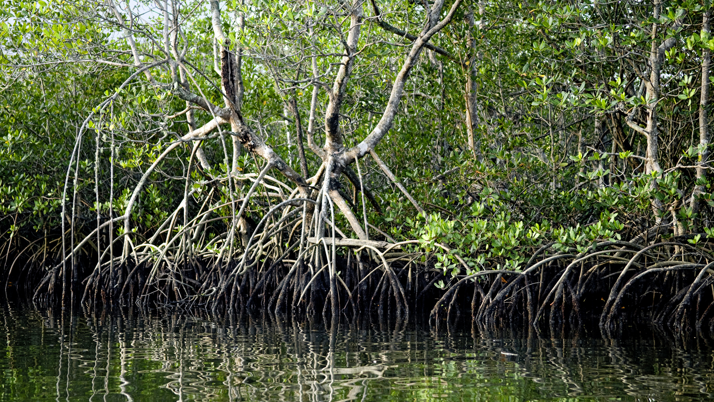 Mangrovenwälder wachsen dort, wo andere Bäume nicht überleben können: im salzigen Wasser an tropischen Küsten. Ihre Wurzeln umklammern den Boden. So kann er bei Hochwasser und Überschwemmungen nicht weggespült werden. Mangroven sind die Kinderstube für unzählige Fischarten und Krebse.