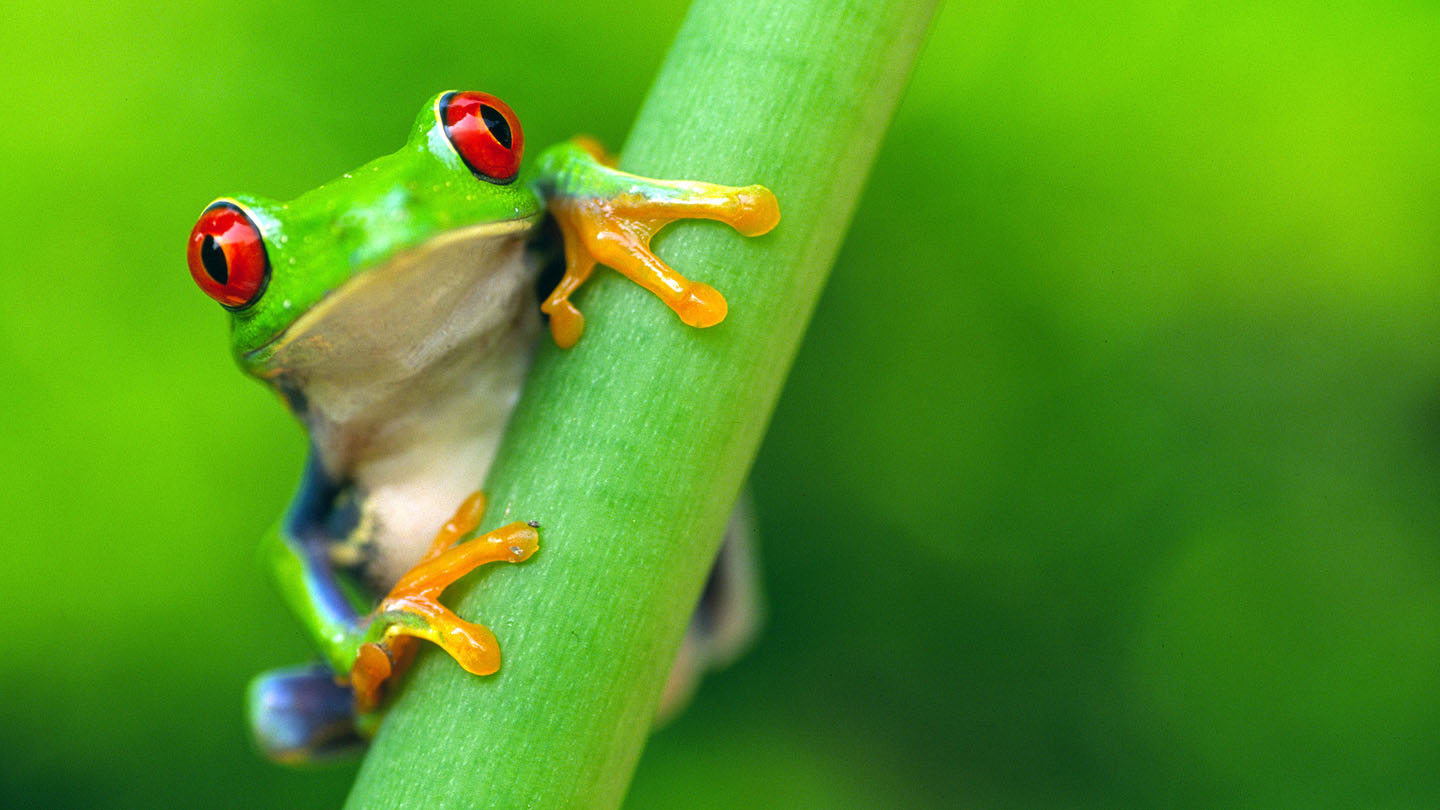 Frösche haben einen rundlichen Körper, lange, kräftige Hinter- und kurze Vorderbeine. Die Vorderfüße haben vier, die Hinterfüße jeweils fünf Zehen. An den Zehenspitzen sitzen breite Haftballen. Die funktionieren wie Saugnäpfe. Damit können sie prima klettern.