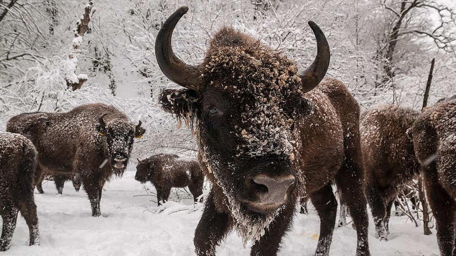 2 Wisente im Kaukasus: Vor 100 Jahren wurde das Rettungsprogramm für die damals in freier Wildbahn ausgestorbenen Wisente ins Leben gerufen. Das Projekt wurde ein Riesenerfolg: Heute streifen wieder über 8.000 Wisente durch europäische Wälder. Auch im Shahdag-Nationalpark in Aserbaidschan: Dort hat der WWF im Rahmen eines Wiederansiedlungsprojekts bisher 36 Tiere ausgewildert. Weitere zehn Wisente verließen im November 2023 den Tierpark Berlin und den Wildpark „Alte Fasanerie“ Hanau nach Aserbaidschan, wo sie zukünftig ein neues Zuhause haben. Mehr über Wisente findest du hier.