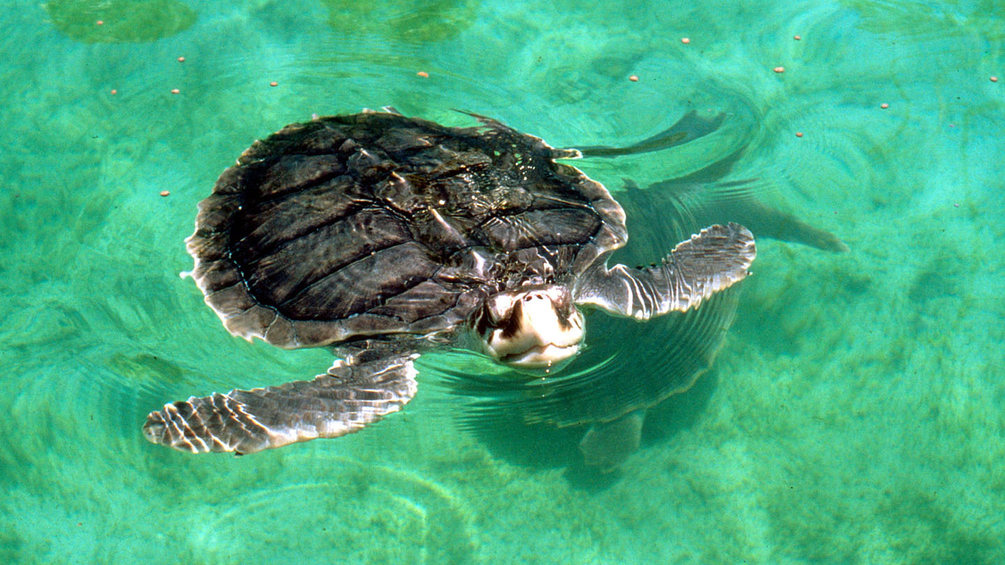 4 Die Atlantik-Bastardschildkröte (oder Karibische Bastardschildkröte) ist mit 70 Zentimetern Länge die kleinste Meeresschildkröte. Sie ist leicht an ihrem fast runden Panzer zu erkennen.