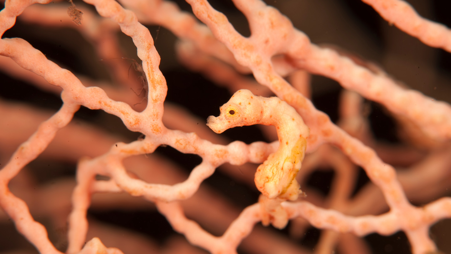 Das Denise-Zwergseepferdchen lebt im Pazifik zum Beispiel vor Indonesien und misst nicht einmal anderthalb Zentimeter. Im Bild sitzt ein Tier in einer Koralle. Mit seinen warzenähnlichen Pusteln sieht das Zwergseepferdchen wie ein Korallenast aus und wird so unsichtbar für Fressfeinde.