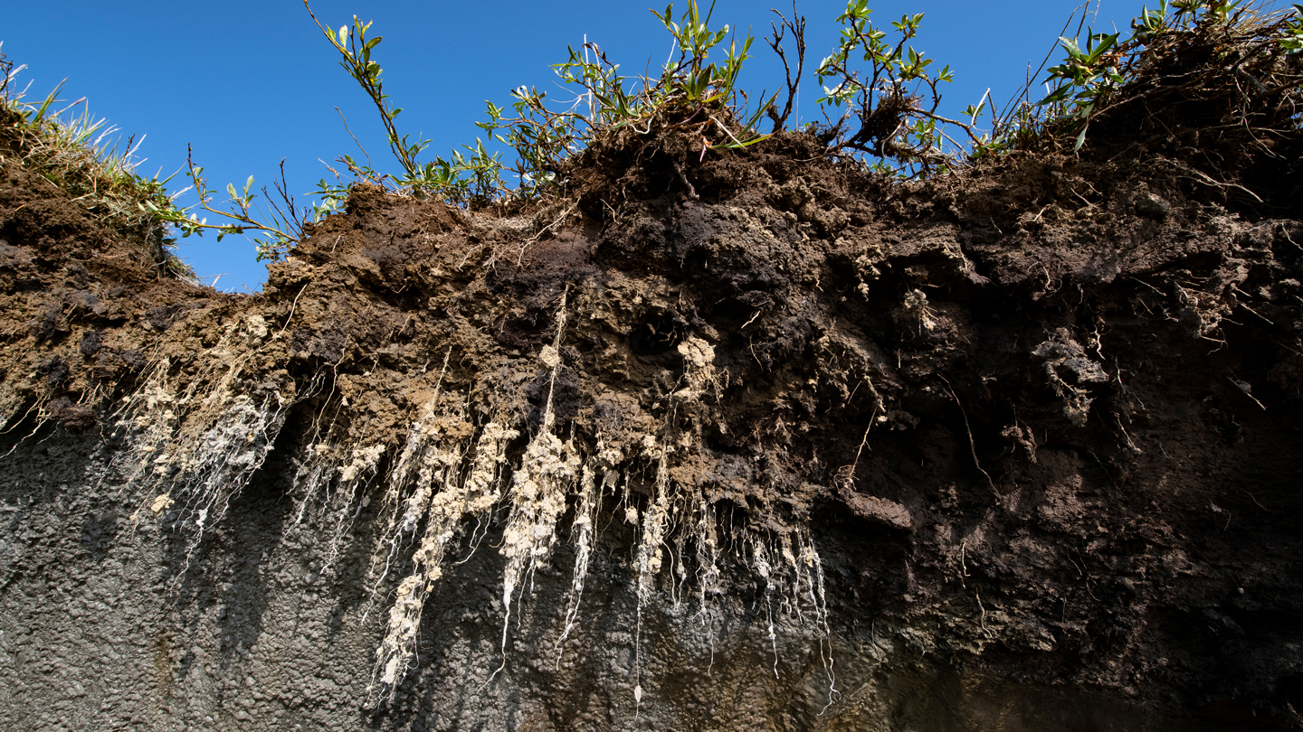 In Sibirien waren die Böden seit tausenden von Jahren fest zugefroren. Nun tauen sie auf und setzen Treibhausgase wie Methan frei, die in ihnen gespeichert waren. Sie bringen außerdem so manche Fossilien wie diesen Mammutknochen ans Tageslicht.